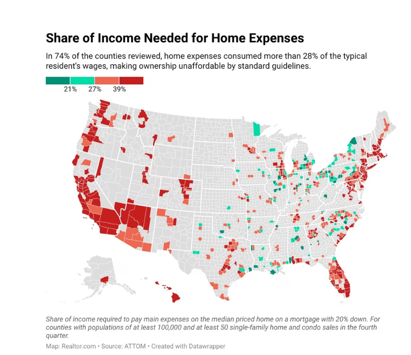 Σε 74% των κομητειών, τα έξοδα αυτά ξεπερνούν το 28% του μέσου εισοδήματος, όριο που διεθνώς θεωρείται το ανώτατο για «προσιτή» κατοικία.