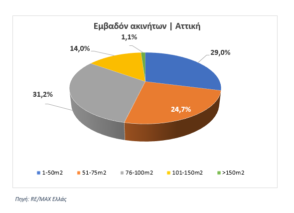 Στην Αττική, το 53,7% των ενοικιασμένων κατοικιών είναι έως 75 τ.μ., ενώ το 45,2% αφορά σπίτια 76–150 τ.μ. Μόνο το 1,1% των μισθώσεων αφορά μεγάλα ακίνητα άνω των 151 τ.μ.