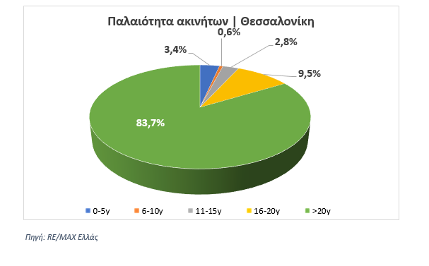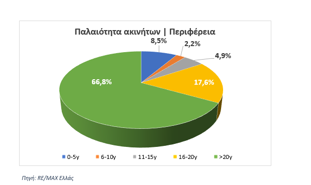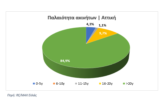 Όσο για την ηλικία των ακινήτων, 84,9% είναι άνω των 20 ετών και μόλις 4,3% είναι νεόδμητα.