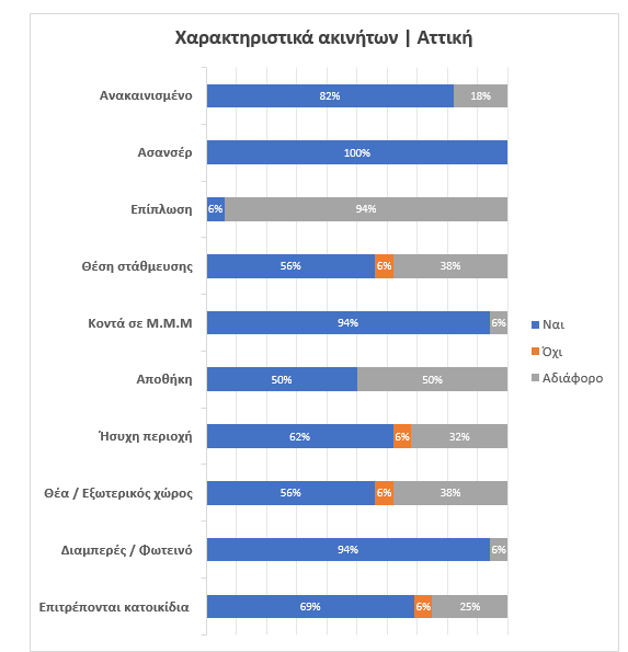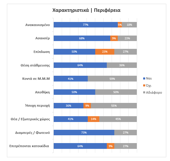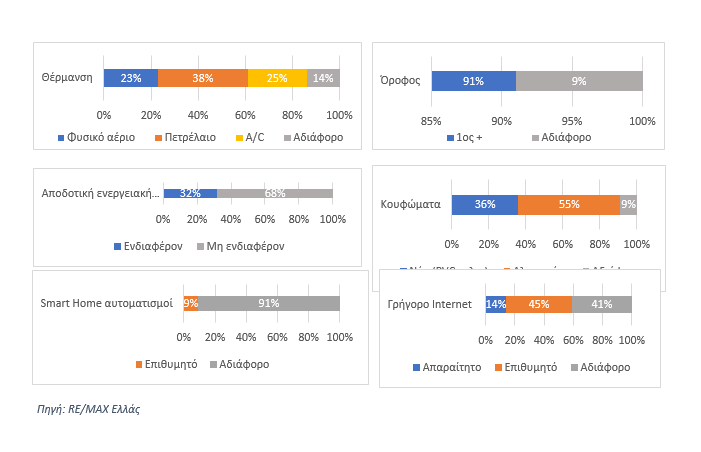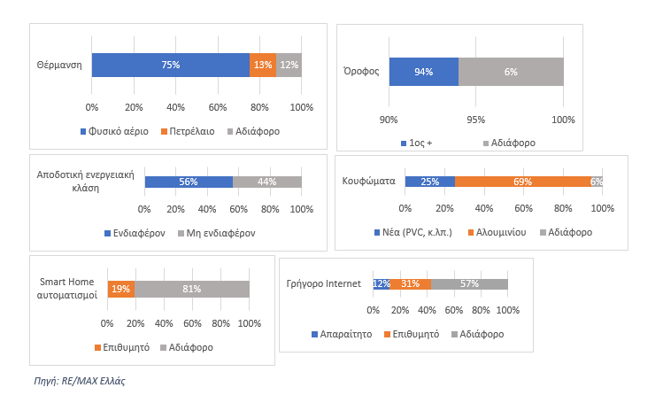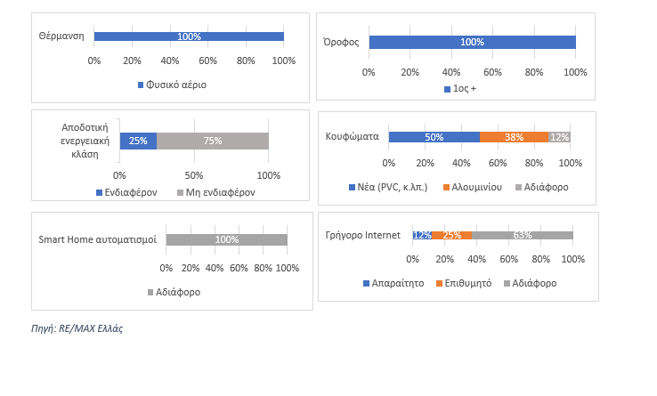 Στη θέρμανση, 75% ζητούν φυσικό αέριο, ενώ μόνο 19% ενδιαφέρονται για Smart Home αυτοματισμούς. Η πρόσβαση σε ΜΜΜ είναι must για το 94%.