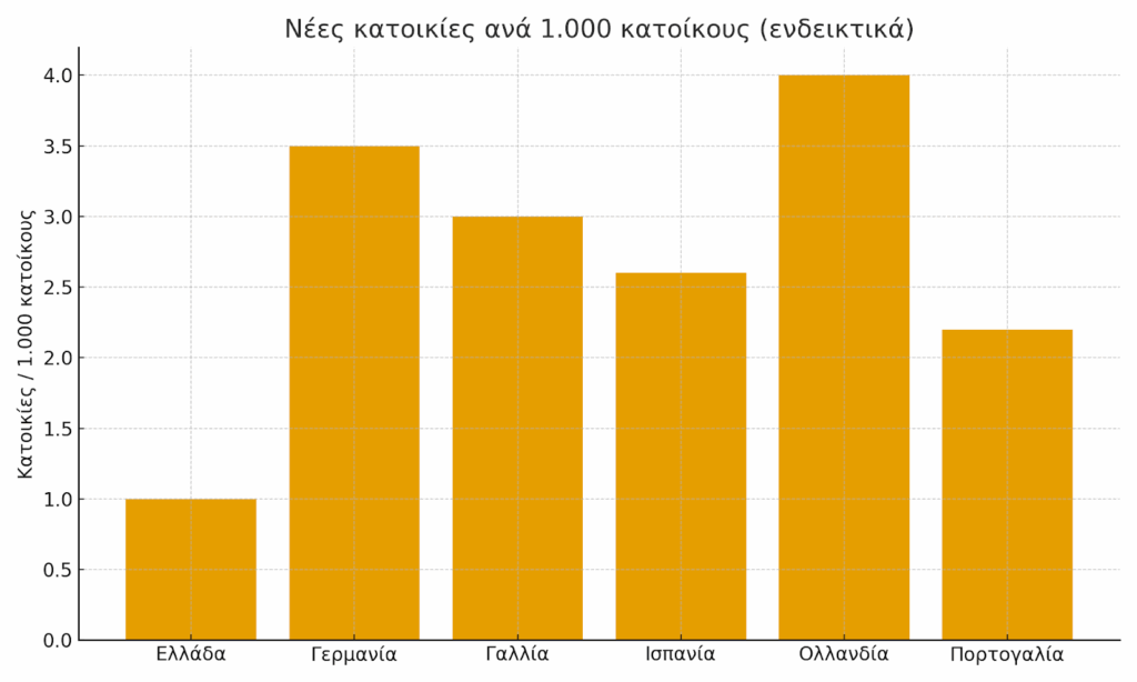 Η παραγωγή νέων κατοικιών είναι μόλις 1 ανά 1.000 κατοίκους – το χαμηλότερο ποσοστό στην Ε.Ε. Τα ενοίκια στην Αθήνα έχουν αυξηθεί κατά 45% από το 2018, ενώ η βραχυχρόνια μίσθωση απορροφά μεγάλο μέρος του διαθέσιμου αποθέματος.