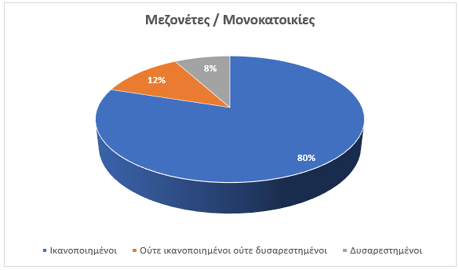 Ιδιαίτερα υψηλό είναι το ποσοστό για τους ιδιοκτήτες μονοκατοικιών, όπου η ικανοποίηση φτάνει το 82%, στοιχείο που υπογραμμίζει ότι όσο μεγαλύτερο και πιο ευρύχωρο είναι το σπίτι, τόσο αυξάνεται η αίσθηση ευημερίας των κατοίκων του.