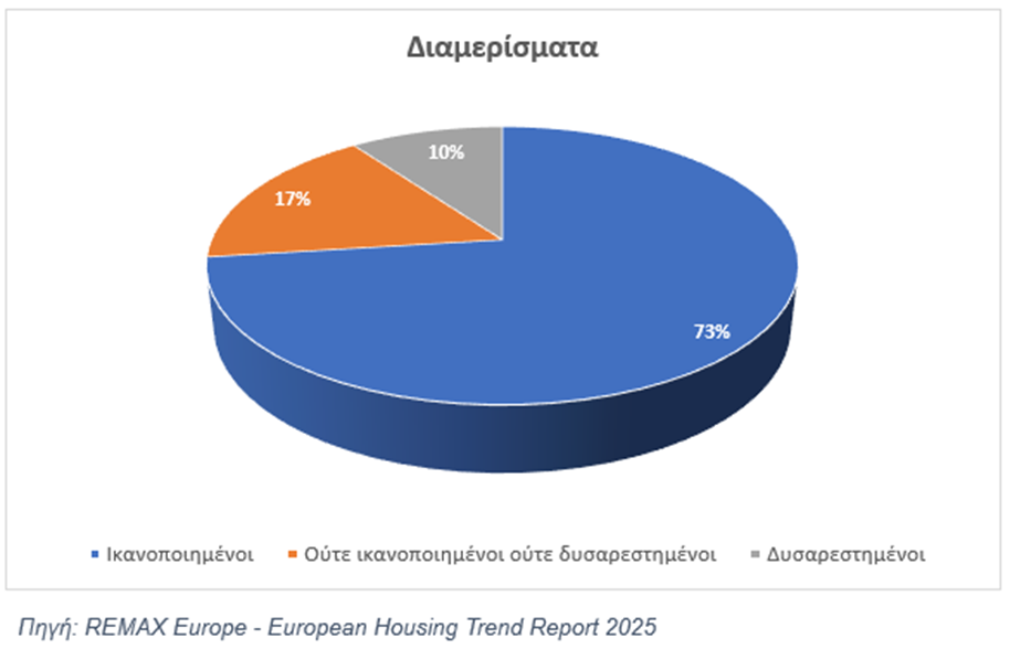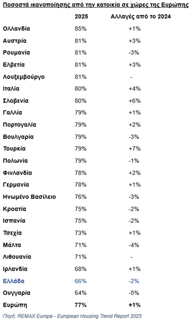 Σε ευρωπαϊκό επίπεδο, το 85% των ιδιοκτητών κατοικιών δηλώνει ικανοποιημένο από τη στεγαστική του κατάσταση, έναντι μόλις 61% των ενοικιαστών.
