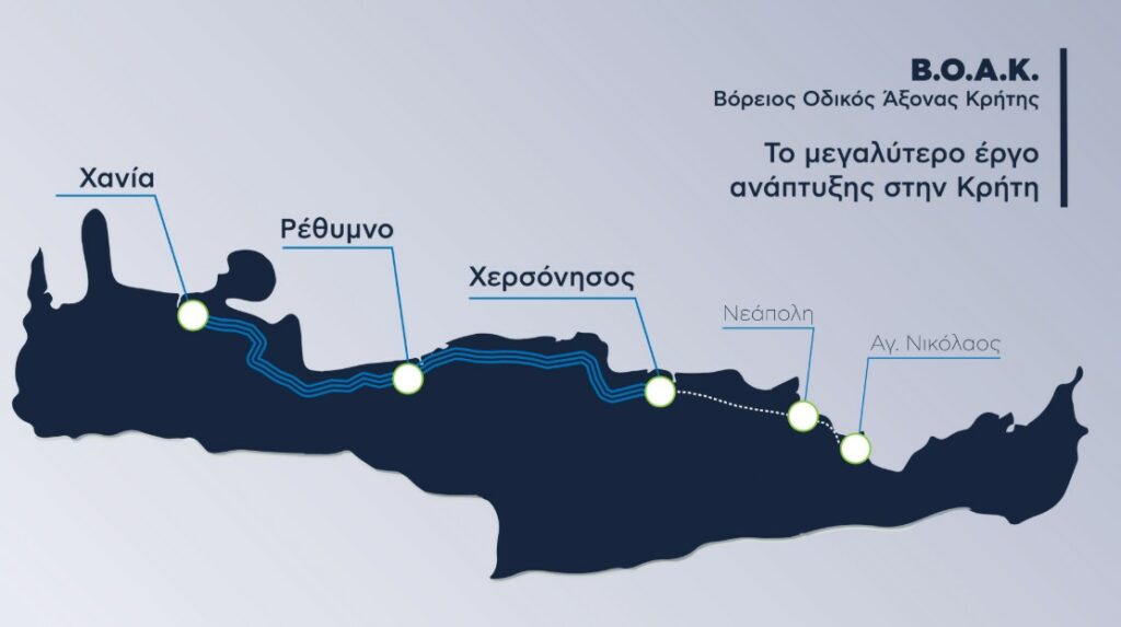Ο Βόρειος Οδικός Άξονας Κρήτης αποτελεί ένα από τα μεγαλύτερα αναπτυξιακά έργα που υλοποιούνται στην Ελλάδα, μείζονος σημασίας για την οδική ασφάλεια, τη διασύνδεση των πόλεων και την περιφερειακή ανάπτυξη. Το συνολικό μήκος του τμήματος Ηράκλειο–Χανιά–Κίσσαμος ανέρχεται σε 187 χλμ. Ο προϋπολογισμός του έργου ανέρχεται σε 2 δισ. ευρώ, ενώ η περίοδος παραχώρησης είναι 35 έτη, εκ των οποίων τα πρώτα πέντε αντιστοιχούν στην περίοδο μελέτης και κατασκευής.
