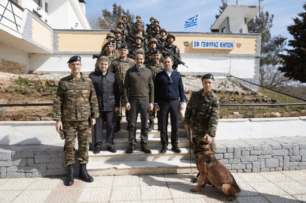 Πριν από την επίσκεψη στο εργοτάξιο, ο πρωθυπουργός βρέθηκε στο στρατιωτικό φυλάκιο της Γέφυρας Κήπων, όπου συνομίλησε με αξιωματικούς και αναφέρθηκε στα γεγονότα της Καθαράς Δευτέρας του 2020 στα ελληνοτουρκικά σύνορα.