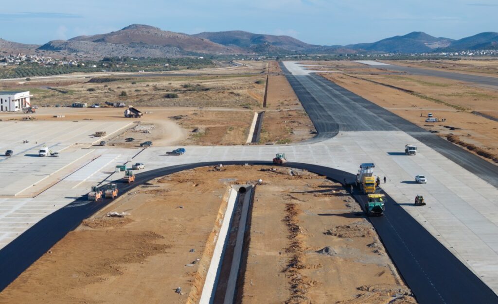 Με την πρόοδο να ξεπερνά το 65% έως τα τέλη Οκτωβρίου του 2025, το έργο απλώνεται σε 6.030 στρέμματα και περιλαμβάνει πλέον πλήρως ανεπτυγμένους τους φέροντες οργανισμούς του Πύργου Ελέγχου, του τερματικού σταθμού και της πλειονότητας των υποστηρικτικών κτιρίων. Η διάστρωση των ειδικών οδοστρωμάτων για προσγείωση, απογείωση και στάθμευση αεροσκαφών βρίσκεται στο 96%, ενώ το Terminal των 93.000 τ.μ. σε επτά επίπεδα είναι ολοκληρωμένο κατά 60%, ποσοστό που ισχύει και για τον πύργο ελέγχου. Παράλληλα, οι ηλεκτρομηχανολογικές εργασίες προχωρούν με ταχείς ρυθμούς στα περισσότερα κτίρια.