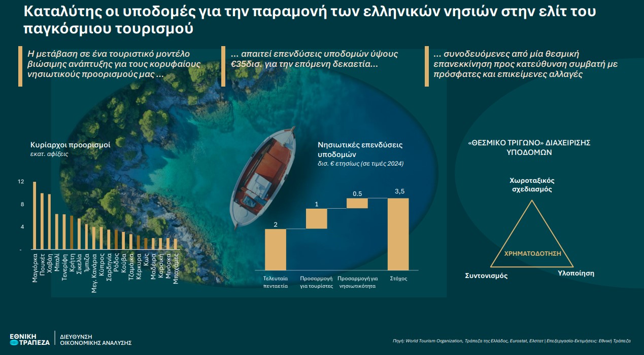 Συνολικά, η απαιτούμενη επενδυτική προσπάθεια ανέρχεται σε περίπου 3,5 δισ. ευρώ ετησίως ή 35 δισ. ευρώ έως το 2035 – προϋπόθεση για να απορροφηθεί η αυξανόμενη ζήτηση (χωρίς να διαρραγεί η φέρουσα ικανότητα) και να ενισχυθεί η παραγωγική βάση των νησιωτικών οικονομιών.